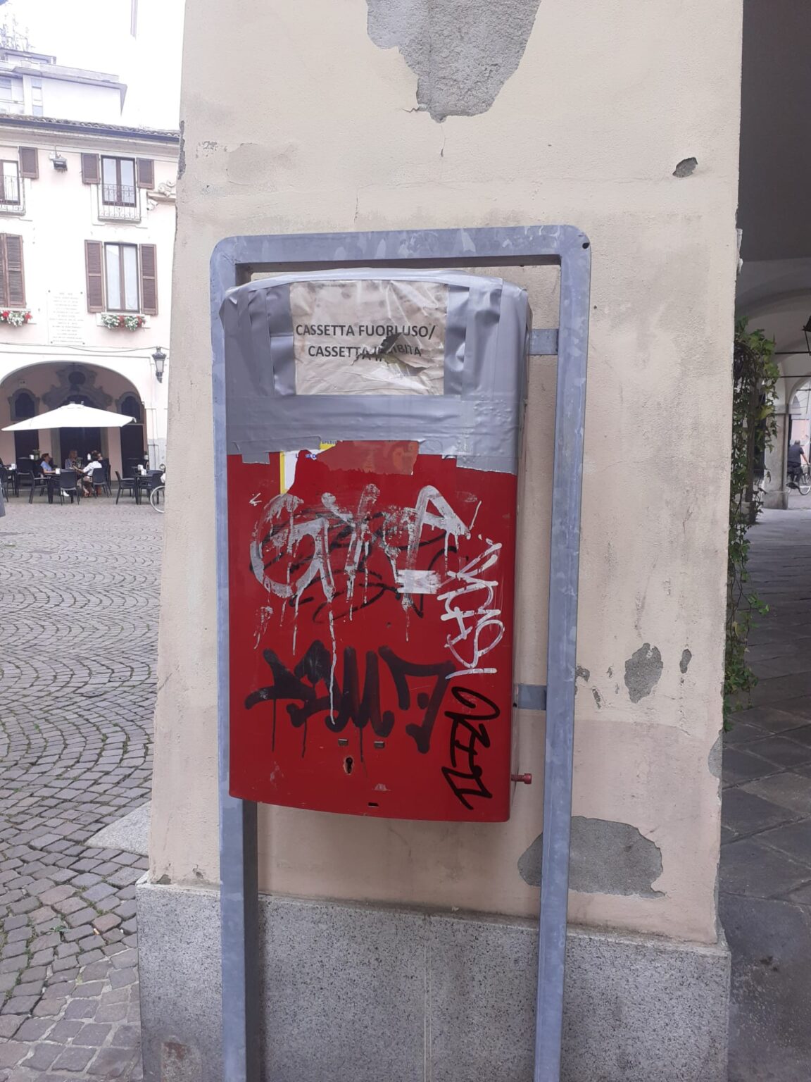 “Da tempo la cassetta per imbucare le lettere, da sempre sull’ultima colonna di piazza Marconi angolo via Borsani, è fuori uso. Ora si presenta ( vedi foto) imbrattata e vandalizzata aggiungendo degrado in una città sempre più decadente. Quasi sicuramente la cassetta è di proprietà di Poste Italiane, il suo stato non dovrebbe forse essere segnalato dall’amministrazione comunale, con richiesta di sostituzione?”